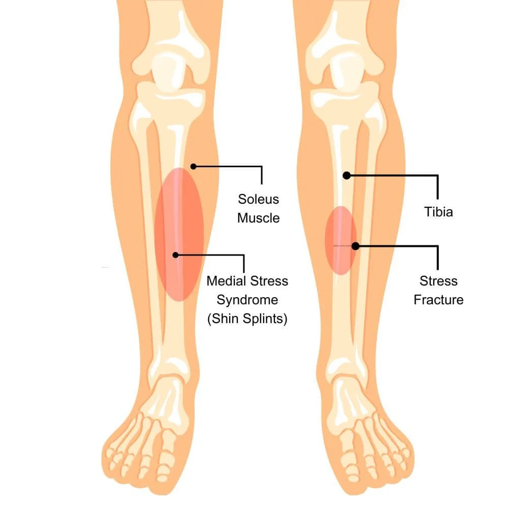 Other conditions like tendonitis, nerve entrapment, or compartment syndrome can cause pain in the same area, but the main condition that can be mistaken for MTSS is a stress fracture. Although the areas of pain can sometimes overlap, the main indication that you have a stress fracture is a smaller more focused area of pain around 2–3 cm in size instead of 5cm seen with MTSS. The pain tends to be sharper and less diffuse than MTSS pain.